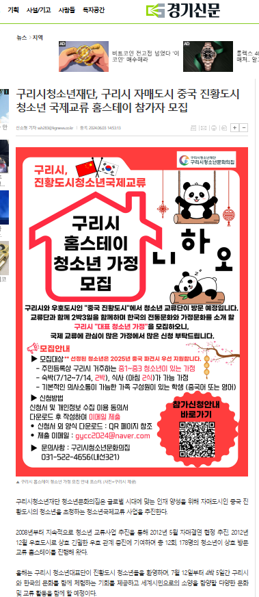 청소년문화의집 구리시청소년재단, 구리시 자매도시 중국 진황도시 청소년 국제교류 홈스테이 참가자 모집(경기신문 외 6곳) 작성자 김찬영 등록일자 2024년 6월 5일 15시 59분 35초 조회 337 경기신문외_1.png [ Size : 177.67KB , Down : 181 ] 미리보기 다운로드 목록보기