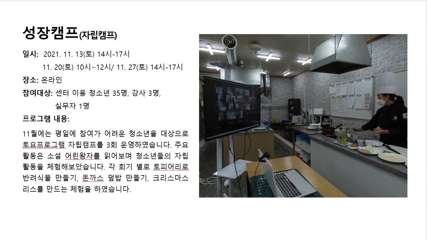 2021년 11월 청소년 성장캠프(학교밖) 작성자 관리자 등록일자 2022년 1월 17일 16시 8분 42초 조회 562 11월 청소년 성장캠프.JPG [ Size : 130.46KB , Down : 233 ] 미리보기 다운로드 목록보기