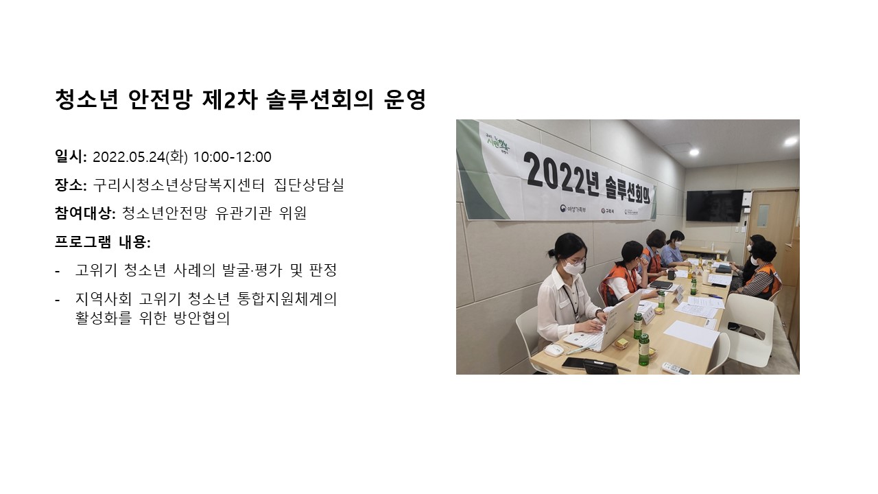 2022년 5월 청소년 안전망 제2차 솔루션회의 운영 작성자 관리자 등록일자 2022년 6월 10일 15시 47분 32초 조회 554 청소년안전망_제2차솔루션회의.JPG [ Size : 105.76KB , Down : 253 ] 미리보기 다운로드 목록보기