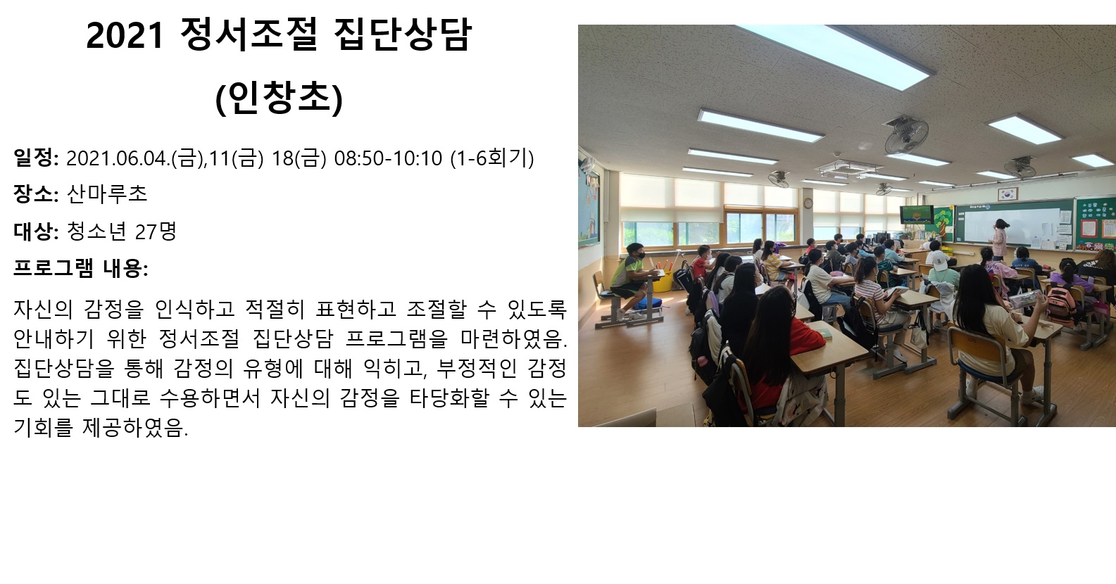 6월 정서조절 집단상담(인창초) 작성자 관리자 등록일자 2021년 8월 3일 17시 34분 47초 조회 452 6월 정서조절 집단상담(인창초).jpg [ Size : 287.48KB , Down : 220 ] 미리보기 다운로드 목록보기