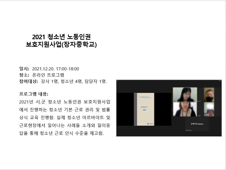 2021년 12월 노동인권 보호지원사업 교육(고등부 심화) 작성자 관리자 등록일자 2022년 1월 17일 16시 17분 20초 조회 464 12월 노동인권 교육(고등부).JPG [ Size : 59.24KB , Down : 248 ] 미리보기 다운로드 목록보기