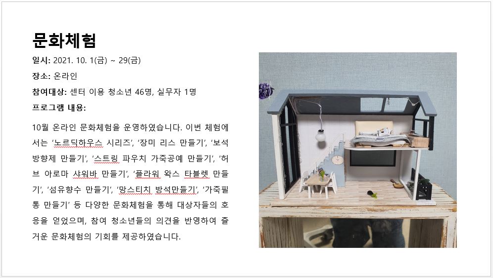 2021년 10월 문화체험(학교밖) 작성자 관리자 등록일자 2022년 1월 10일 11시 54분 14초 조회 490 학교밖-문화체험(10월).JPG [ Size : 86.42KB , Down : 214 ] 미리보기 다운로드 목록보기