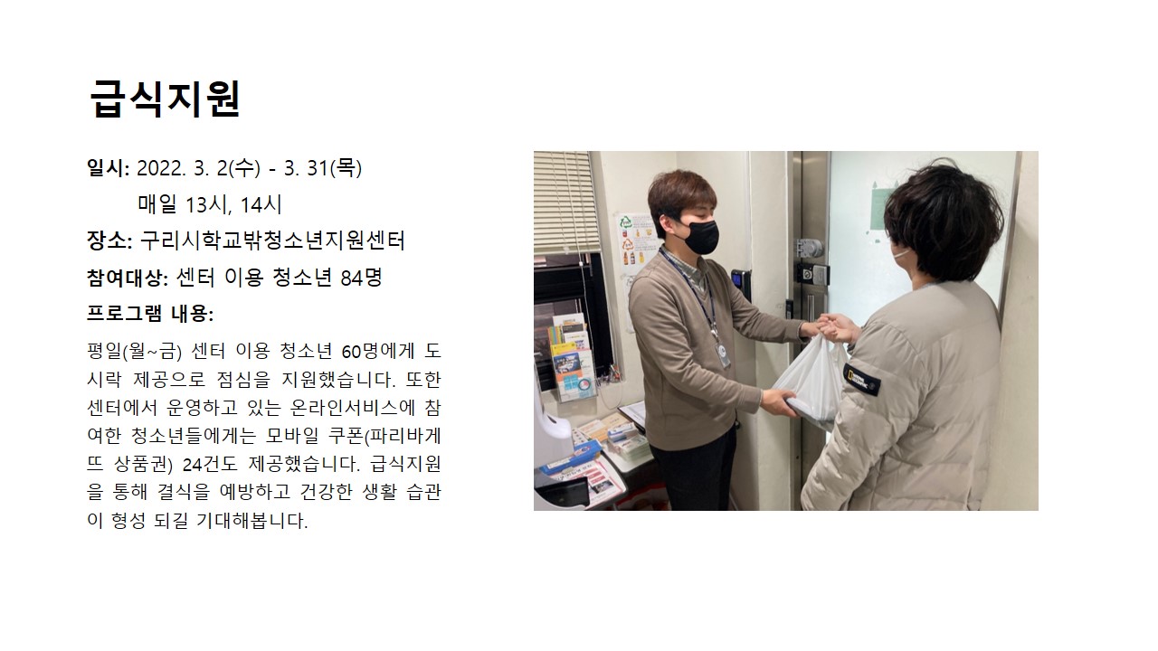 2022년 3월 급식지원 (학교밖) 작성자 관리자 등록일자 2022년 4월 5일 9시 22분 31초 조회 547 급식지원.JPG [ Size : 136.63KB , Down : 238 ] 미리보기 다운로드 목록보기