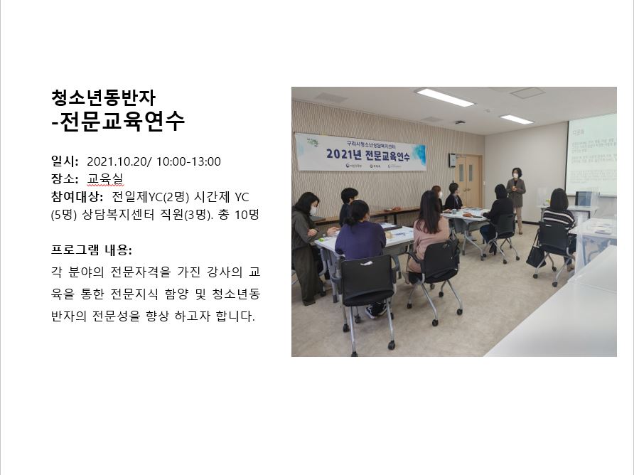 2021년 10월 전문교육연수 작성자 관리자 등록일자 2022년 1월 17일 15시 23분 16초 조회 451 10월 전문교육연수.JPG [ Size : 69.67KB , Down : 209 ] 미리보기 다운로드 목록보기