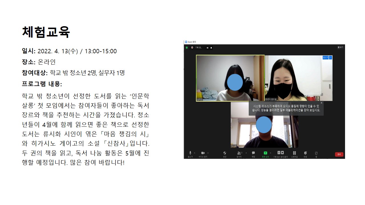 2022년 4월 체험교육 (학교밖) 작성자 관리자 등록일자 2022년 5월 6일 11시 13분 19초 조회 512 3. 체험교육.JPG [ Size : 128.3KB , Down : 210 ] 미리보기 다운로드 목록보기