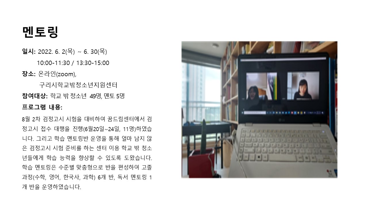 2022년 6월 멘토링 (학교밖) 작성자 관리자 등록일자 2022년 7월 8일 14시 19분 9초 조회 406 2022년 6월 멘토링 (학교밖).JPG [ Size : 130.37KB , Down : 212 ] 미리보기 다운로드 목록보기