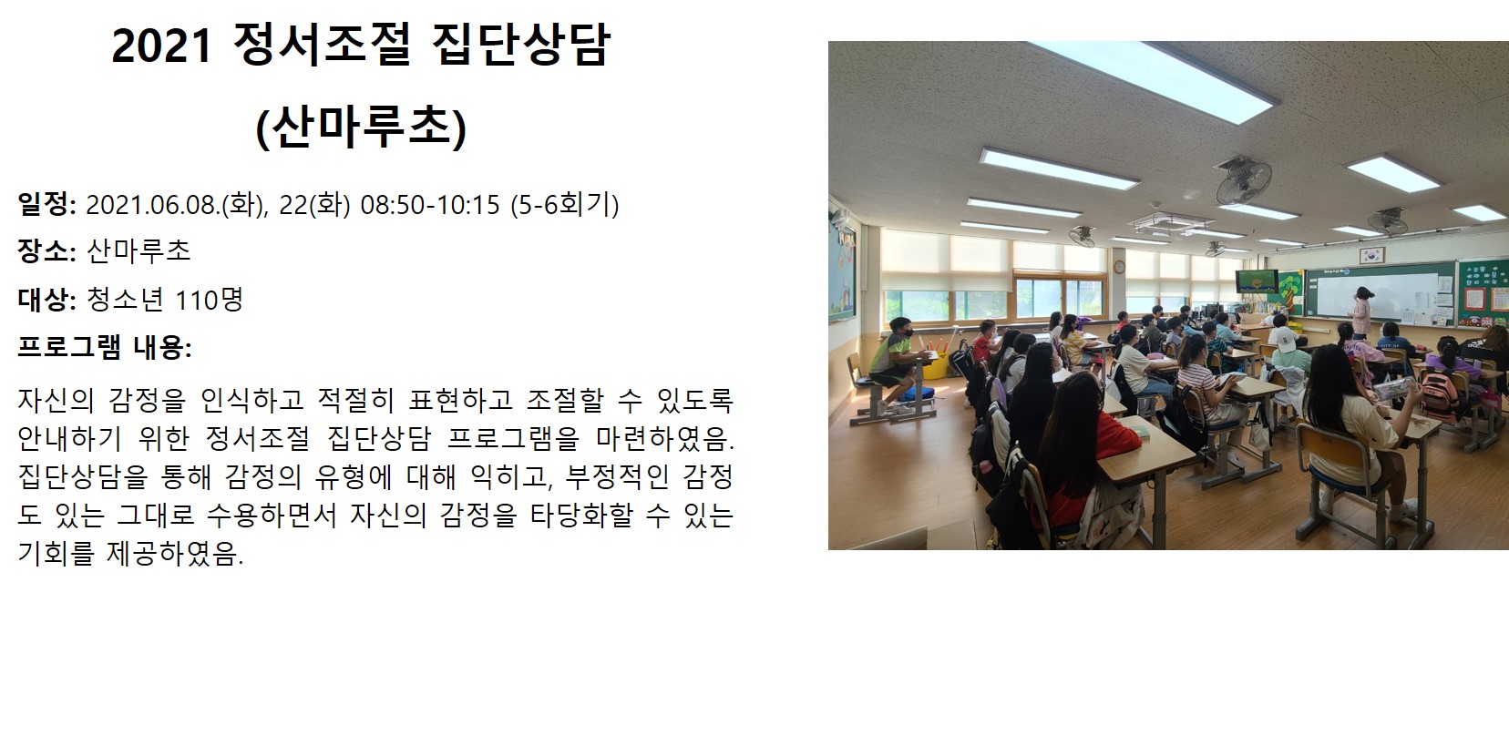 6월 정서조절 집단상담(산마루초) 작성자 관리자 등록일자 2021년 8월 3일 17시 31분 2초 조회 409 6월 정서조절 집단상담(산마루초).jpg [ Size : 240.3KB , Down : 224 ] 미리보기 다운로드 목록보기