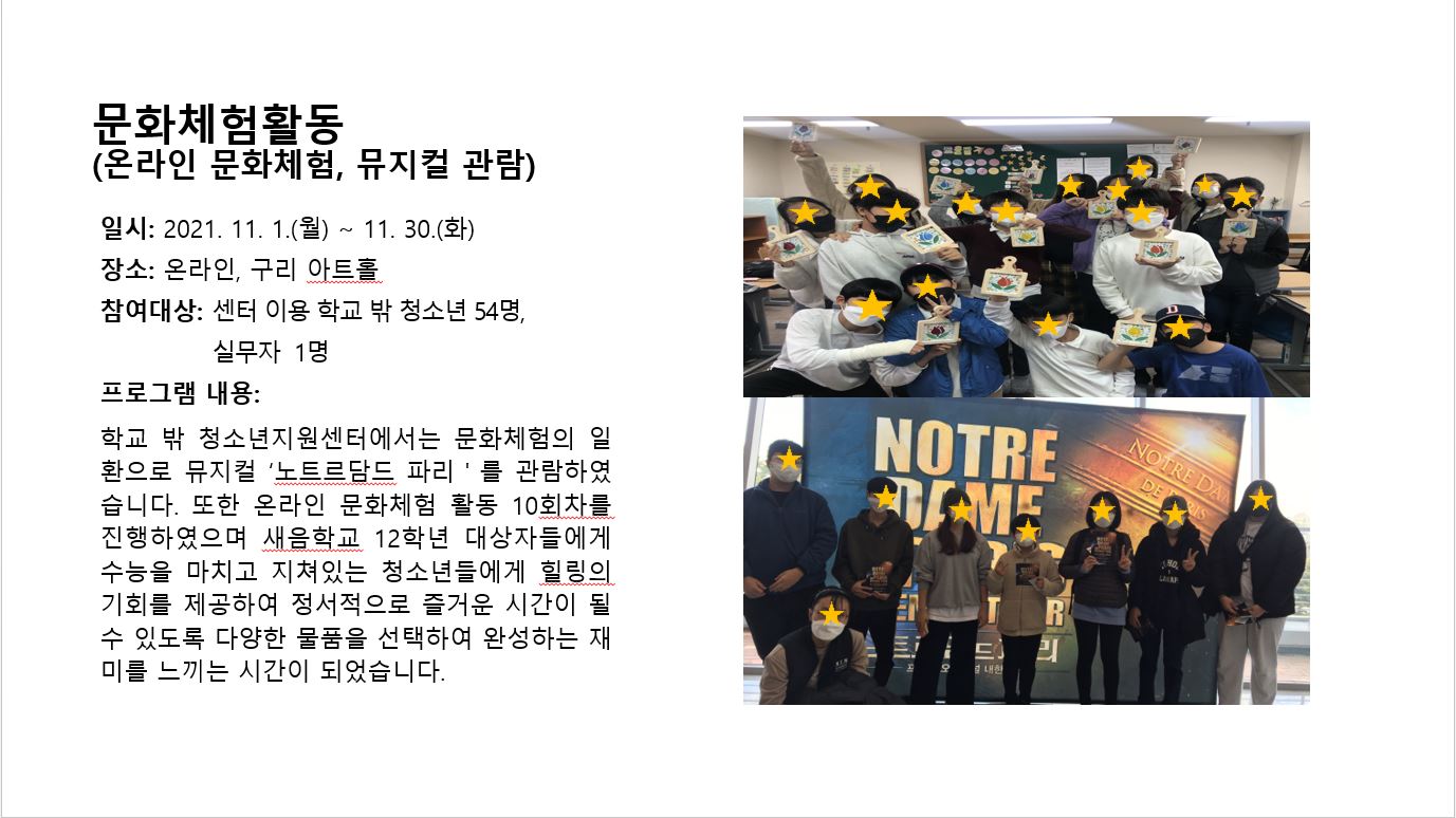 2021년 11월 청소년 문화체험활동(학교밖) 작성자 관리자 등록일자 2022년 1월 17일 16시 9분 21초 조회 449 11월 청소년 문화체험활동.JPG [ Size : 156.21KB , Down : 219 ] 미리보기 다운로드 목록보기