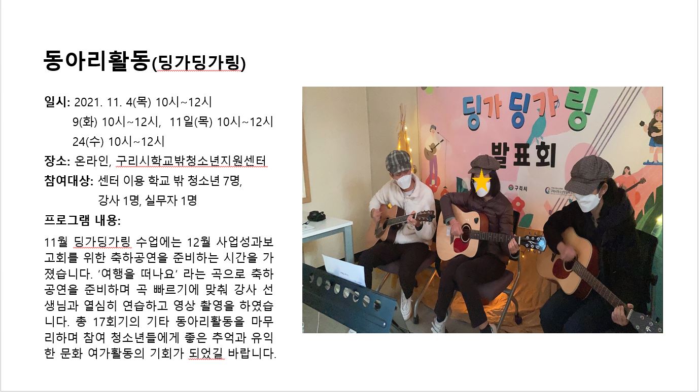 2021년 11월 동아리활동(딩가딩가링, 학교밖) 작성자 관리자 등록일자 2022년 1월 17일 16시 9분 49초 조회 525 11월 동아리활동(딩가딩가링).JPG [ Size : 153.4KB , Down : 253 ] 미리보기 다운로드 목록보기