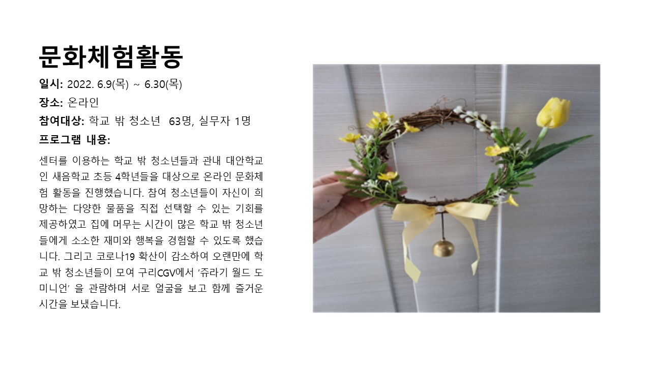 2022년 6월 문화체험활동 (학교밖) 작성자 관리자 등록일자 2022년 7월 8일 14시 17분 59초 조회 452 2022년 6월 문화체험활동 (학교밖).JPG [ Size : 133KB , Down : 208 ] 미리보기 다운로드 목록보기