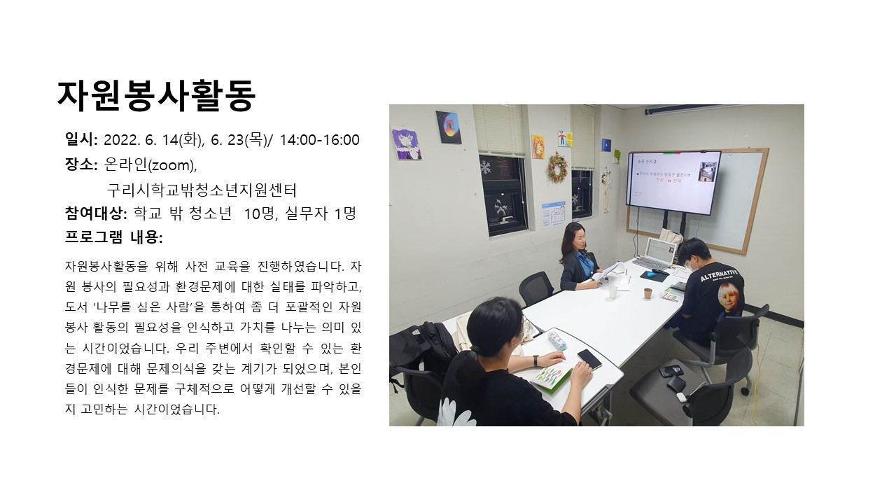 2022년 6월 자원봉사활동 (학교밖) 작성자 관리자 등록일자 2022년 7월 8일 14시 17분 23초 조회 424 2022년 6월 자원봉사활동 (학교밖).JPG [ Size : 141.74KB , Down : 208 ] 미리보기 다운로드 목록보기