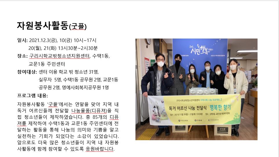 2021년 12월 자원봉사활동(굿플, 학교밖) 작성자 관리자 등록일자 2022년 1월 24일 11시 46분 54초 조회 526 자원봉사활동(굿플,학교밖).JPG [ Size : 100.04KB , Down : 258 ] 미리보기 다운로드 목록보기