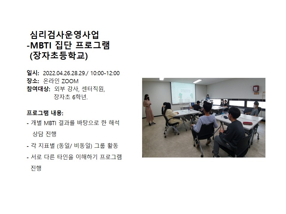 2022년 4월 심리검사운영사업-MBTI 집단 프로그램(장자초등학교) 작성자 관리자 등록일자 2022년 5월 19일 11시 56분 23초 조회 550 2022년 4월 MBTI프로그램.JPG [ Size : 88.25KB , Down : 317 ] 미리보기 다운로드 목록보기