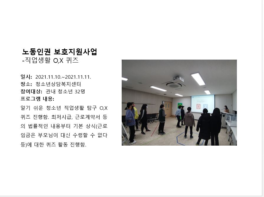 2021년 11월 노동인권 보호지원사업-알기 쉬운 청소년 직업생활 O,X 퀴즈 작성자 관리자 등록일자 2022년 1월 17일 16시 2분 55초 조회 482 11월 노동인권 보호지원사업 O,X 퀴즈.JPG [ Size : 61.79KB , Down : 295 ] 미리보기 다운로드 목록보기