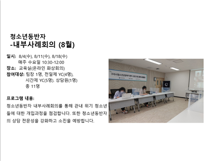 청소년동반자 8월 내부사례회의 작성자 관리자 등록일자 2021년 9월 6일 12시 47분 45초 조회 494 내부사례회의.png [ Size : 69.02KB , Down : 242 ] 미리보기 다운로드 목록보기