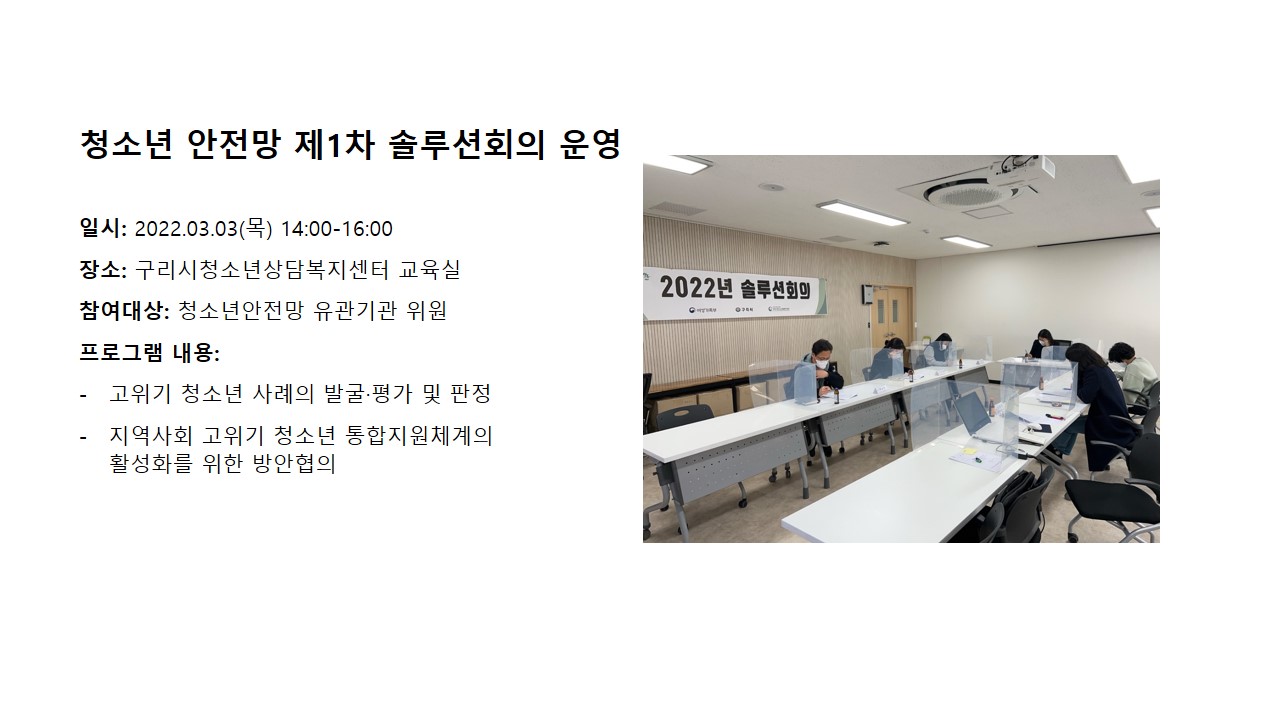 2022년 3월 청소년 안전망 제1차 솔루션회의 운영 작성자 관리자 등록일자 2022년 4월 8일 14시 13분 30초 조회 528 슬라이드1.JPG [ Size : 110.6KB , Down : 246 ] 미리보기 다운로드 목록보기