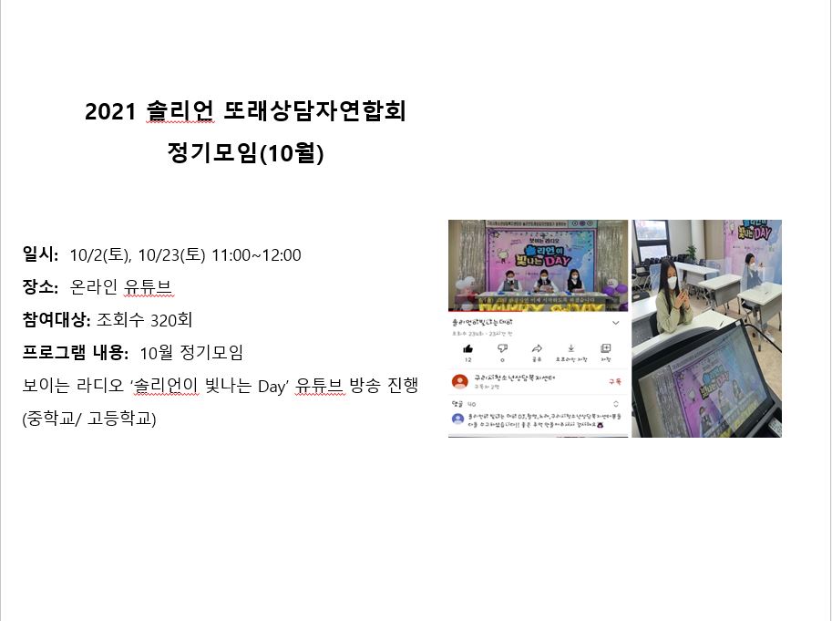 2021년 10월 솔리언또래상담자연합회 정기모임 작성자 관리자 등록일자 2022년 1월 11일 17시 43분 22초 조회 492 솔리언 또래상담자연합회 정기모임.JPG [ Size : 64.4KB , Down : 246 ] 미리보기 다운로드 목록보기
