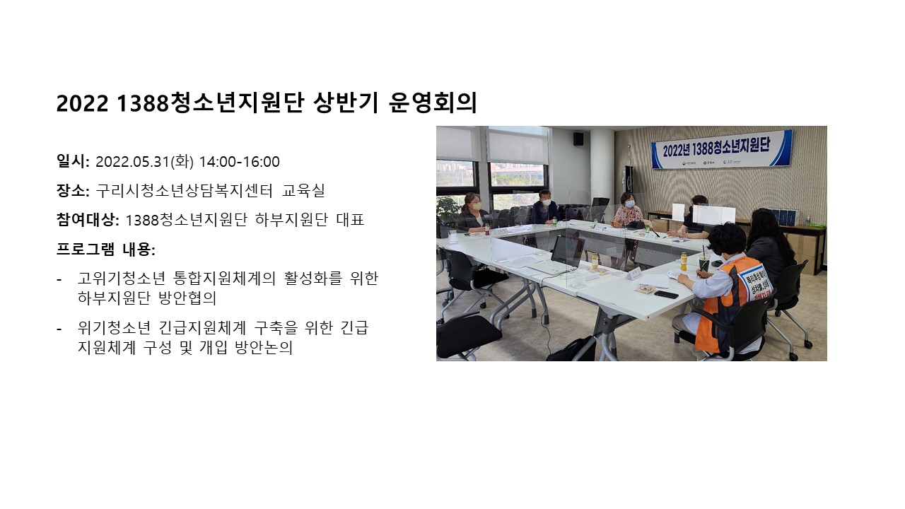 2022년 5월 1388 청소년지원단 상반기 운영회의 작성자 관리자 등록일자 2022년 6월 10일 15시 49분 20초 조회 578 1388청소년지원단 상반기 운영회의.JPG [ Size : 127.65KB , Down : 244 ] 미리보기 다운로드 목록보기