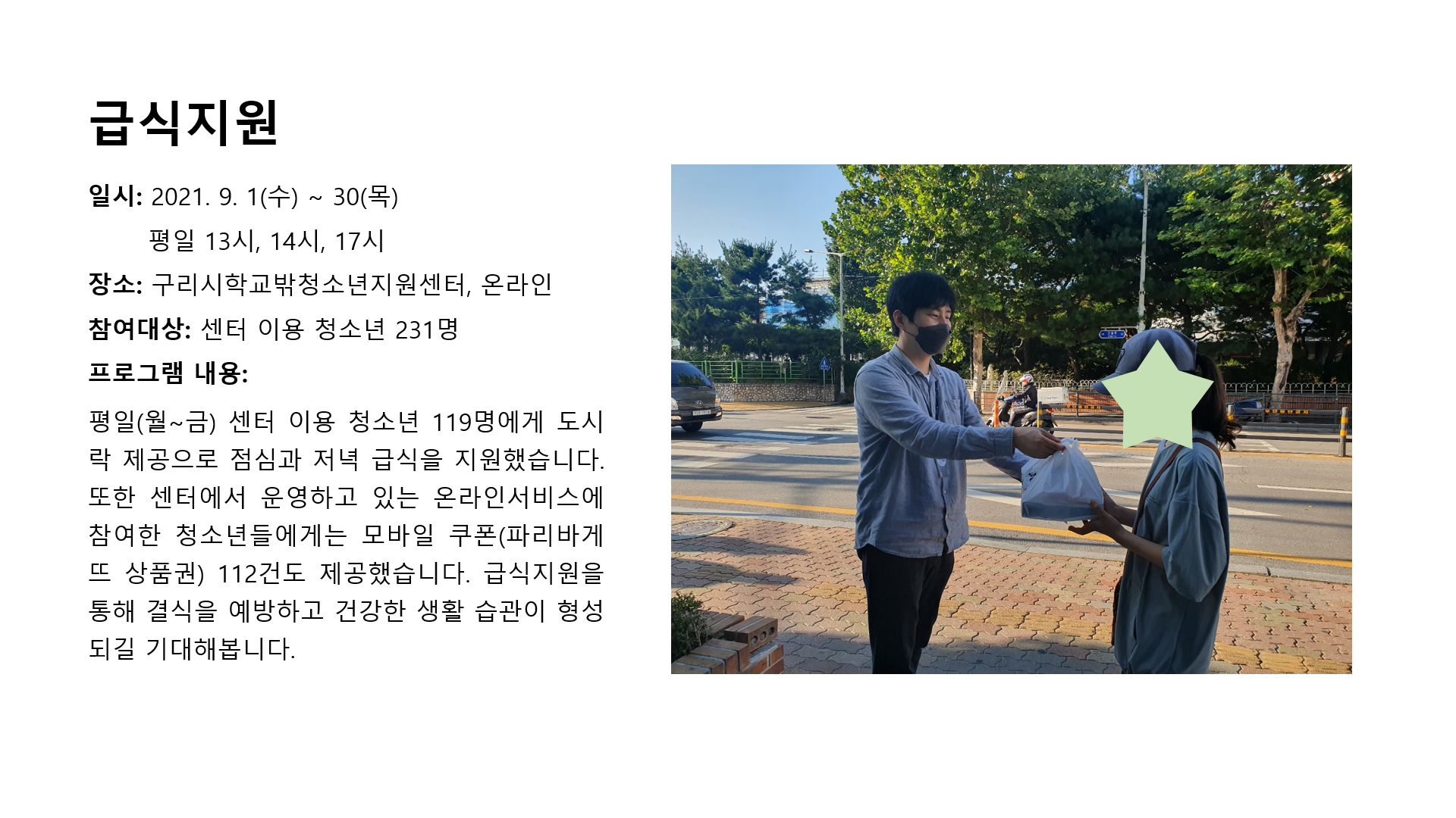 급식지원(학교밖) 작성자 관리자 등록일자 2021년 10월 1일 19시 12분 6초 조회 437 학교밖-급식지원(9월).png [ Size : 1.4MB , Down : 209 ] 미리보기 다운로드 목록보기