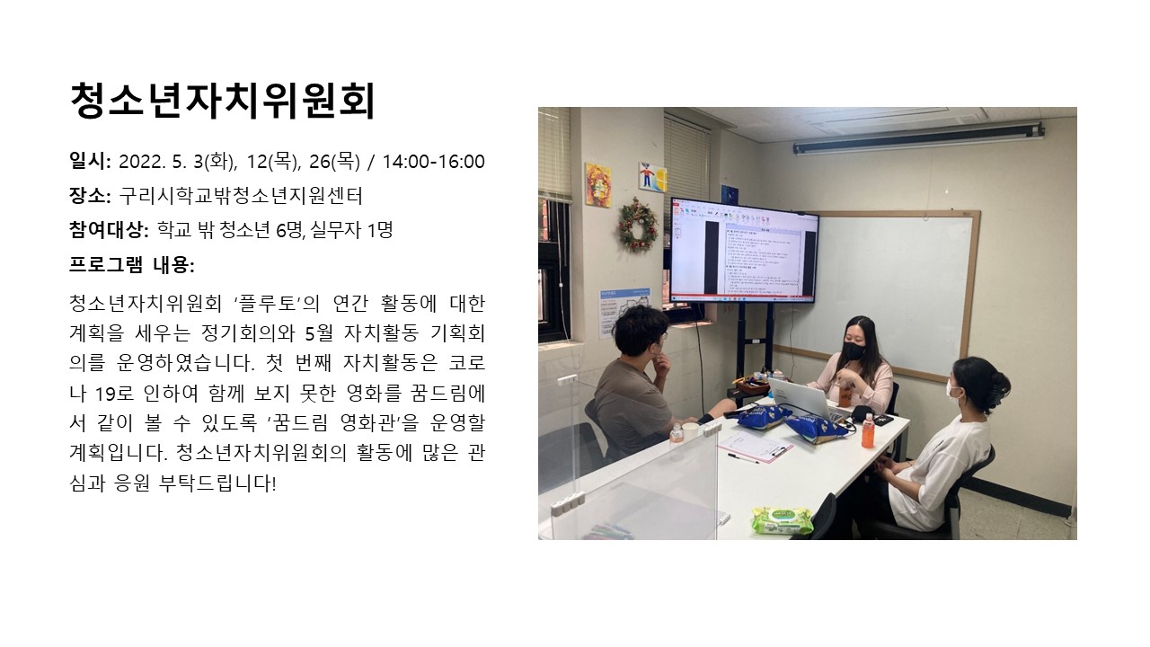 2022년 5월 청소년자치위원회 (학교밖) 작성자 관리자 등록일자 2022년 6월 10일 15시 40분 38초 조회 458 청소년자치위원회.JPG [ Size : 146.95KB , Down : 225 ] 미리보기 다운로드 목록보기