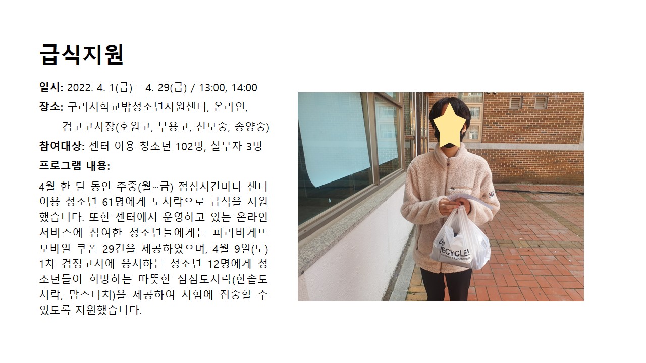 2022년 4월 급식지원 (학교밖) 작성자 관리자 등록일자 2022년 5월 6일 11시 14분 48초 조회 488 6. 급식지원.JPG [ Size : 184.33KB , Down : 214 ] 미리보기 다운로드 목록보기