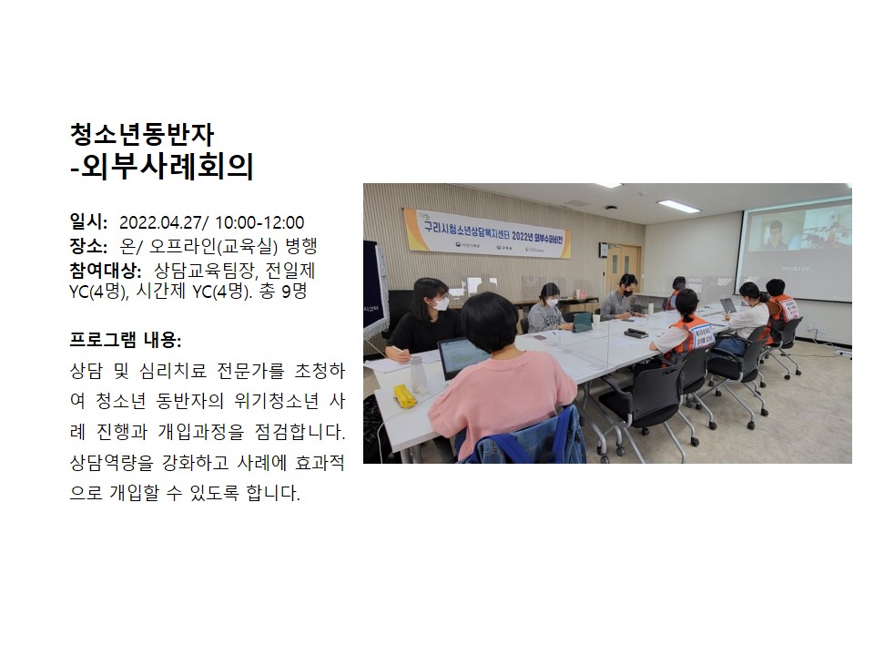 2022년 4월 청소년동반자_외부사례회의 작성자 관리자 등록일자 2022년 5월 10일 9시 53분 12초 조회 591 청소년동반자-외부사례회의.JPG [ Size : 107.19KB , Down : 251 ] 미리보기 다운로드 목록보기