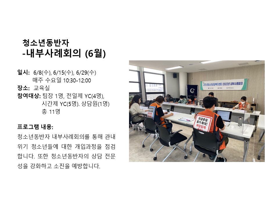 2022년 6월 청소년동반자_내부사례회의 작성자 관리자 등록일자 2022년 7월 8일 14시 24분 57초 조회 531 2022년 6월 청소년동반자_내부사례회의.JPG [ Size : 111.56KB , Down : 315 ] 미리보기 다운로드 목록보기