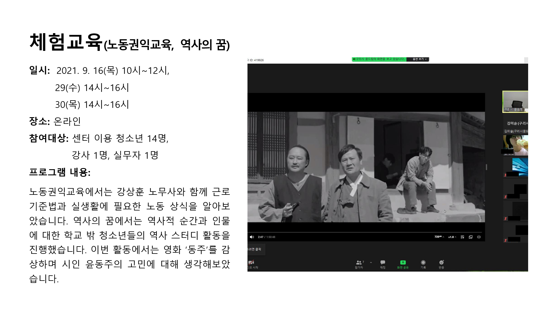체험교육 노동권익교육, 역사의 꿈(학교밖) 작성자 관리자 등록일자 2021년 10월 1일 19시 14분 46초 조회 499 학교밖-체험교육(노동권익교육, 9월).png [ Size : 414.2KB , Down : 220 ] 미리보기 다운로드 목록보기