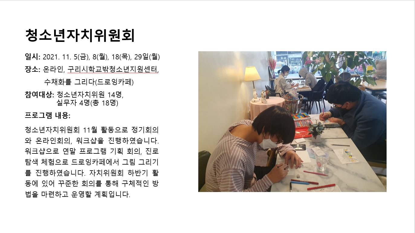 2021년 11월 청소년 자치위원회(학교밖) 작성자 관리자 등록일자 2022년 1월 17일 16시 7분 56초 조회 531 11월 청소년 자치위원회.JPG [ Size : 137.49KB , Down : 219 ] 미리보기 다운로드 목록보기