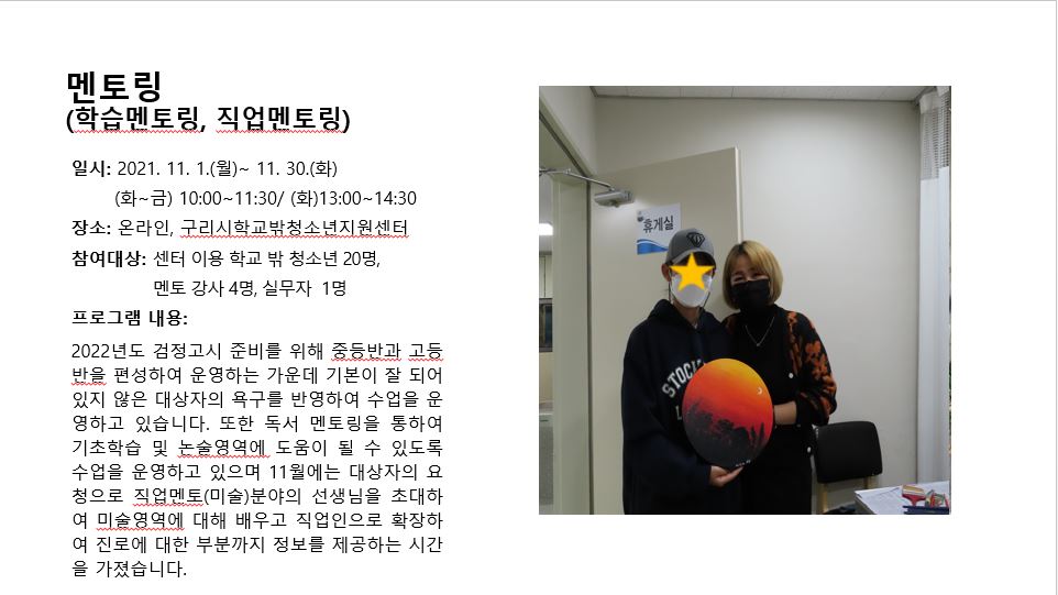 2021년 11월 멘토링(학교밖) 작성자 관리자 등록일자 2022년 1월 17일 16시 11분 23초 조회 531 11월 멘토링.JPG [ Size : 85.12KB , Down : 220 ] 미리보기 다운로드 목록보기