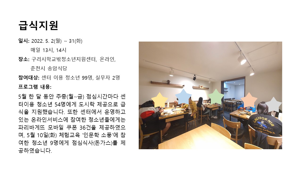 2022년 5월 급식지원 (학교밖) 작성자 관리자 등록일자 2022년 6월 10일 15시 43분 32초 조회 480 급식지원.JPG [ Size : 146.54KB , Down : 206 ] 미리보기 다운로드 목록보기