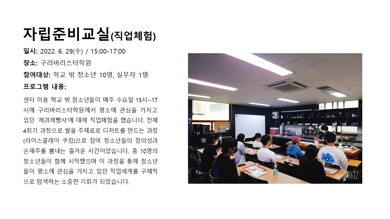 2022년 6월 자립준비교실_직업체험 (학교밖) 작성자 관리자 등록일자 2022년 7월 8일 14시 16분 12초 조회 421 2022년 6월 자립준비교실_직업체험 (학교밖).JPG [ Size : 158.44KB , Down : 197 ] 미리보기 다운로드 목록보기