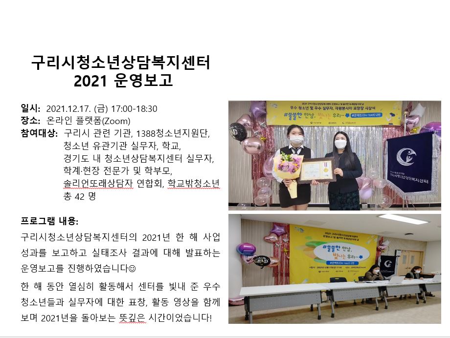 2021년 12월 상담복지센터 운영보고 작성자 관리자 등록일자 2022년 1월 17일 16시 25분 47초 조회 681 2021 운영보고.JPG [ Size : 118.56KB , Down : 277 ] 미리보기 다운로드 목록보기