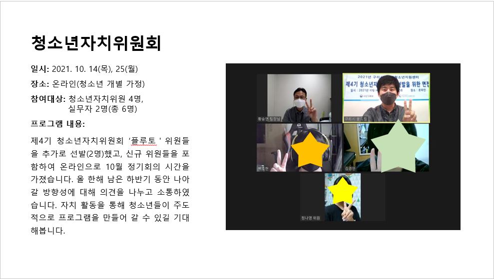 2021년 10월 자치위원회(학교밖) 작성자 관리자 등록일자 2022년 1월 10일 11시 56분 44초 조회 452 학교밖-청소년자치위원회(10월).JPG [ Size : 76.31KB , Down : 205 ] 미리보기 다운로드 목록보기