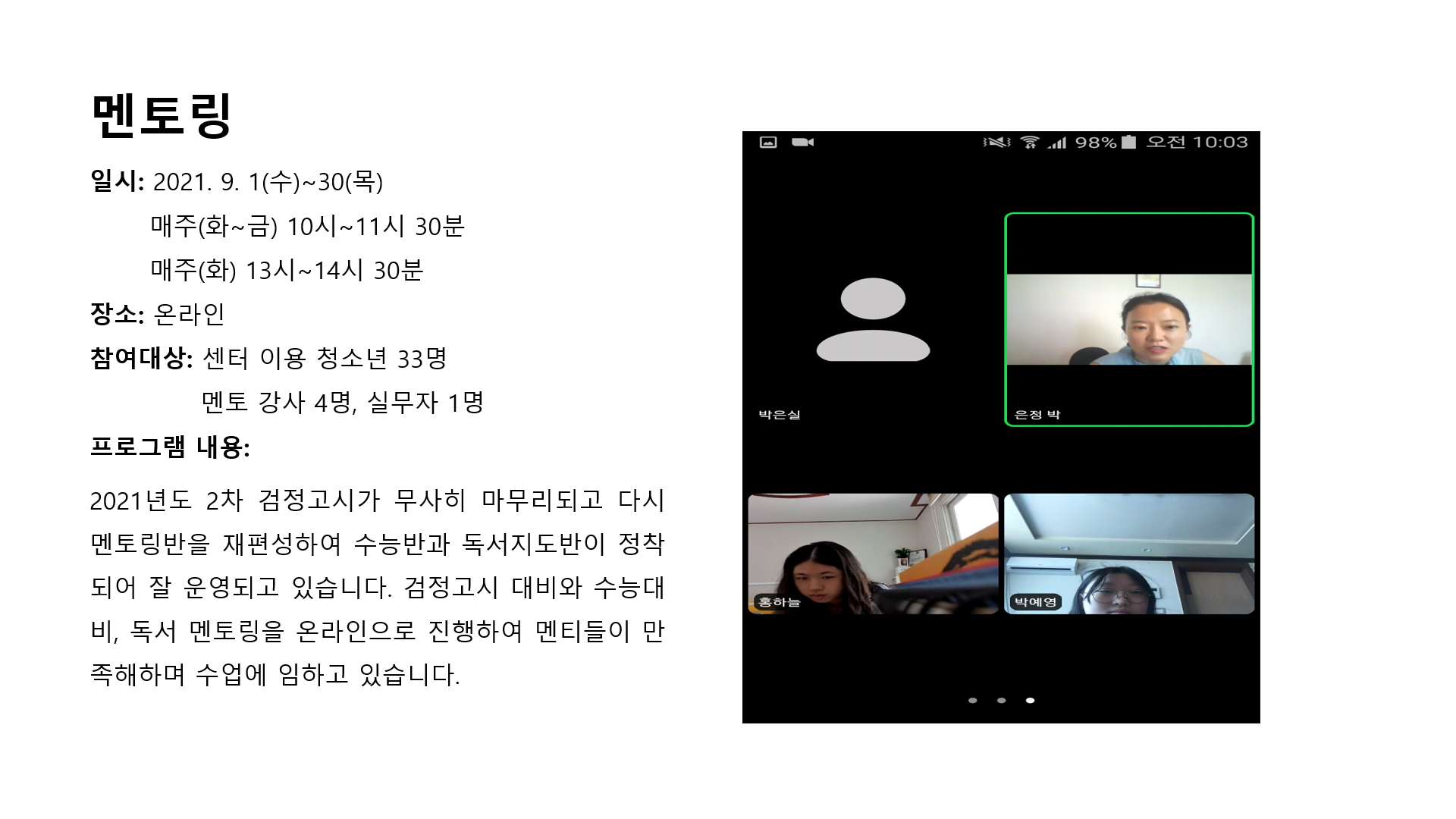 멘토링(학교밖) 작성자 관리자 등록일자 2021년 10월 1일 19시 12분 42초 조회 462 학교밖-멘토링(9월).png [ Size : 378.73KB , Down : 211 ] 미리보기 다운로드 목록보기