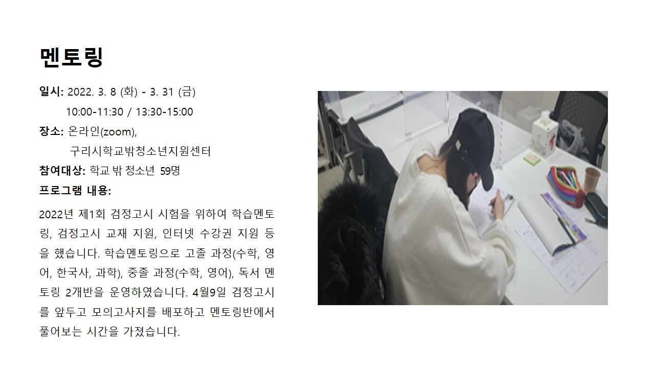 2022년 3월 멘토링 (학교밖) 작성자 관리자 등록일자 2022년 4월 5일 9시 23분 27초 조회 538 멘토링.JPG [ Size : 126.97KB , Down : 220 ] 미리보기 다운로드 목록보기