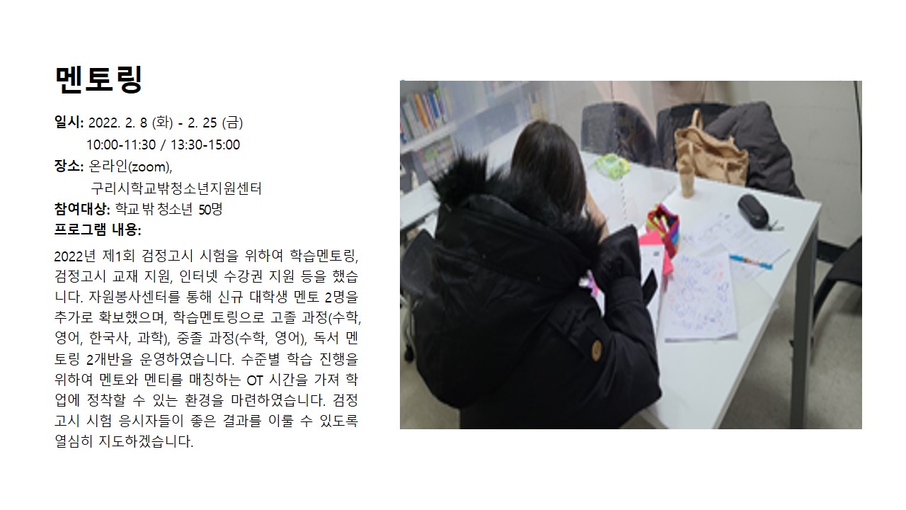 2022년 2월 멘토링(학교밖) 작성자 관리자 등록일자 2022년 3월 7일 10시 22분 49초 조회 586 멘토링.JPG [ Size : 146.18KB , Down : 248 ] 미리보기 다운로드 목록보기