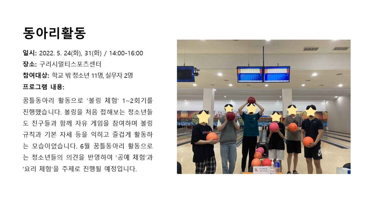2022년 5월 동아리활동 (학교밖) 작성자 관리자 등록일자 2022년 6월 10일 15시 41분 52초 조회 493 동아리활동.JPG [ Size : 147.64KB , Down : 394 ] 미리보기 다운로드 목록보기
