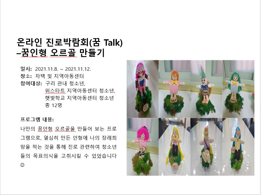 20210년 11월 온라인 진로박람회-꿈인형 오르골 만들기 작성자 관리자 등록일자 2022년 1월 17일 15시 56분 25초 조회 486 11월 온라인 진로박람회-꿈인형 오르골 만들기.JPG [ Size : 85.59KB , Down : 229 ] 미리보기 다운로드 목록보기