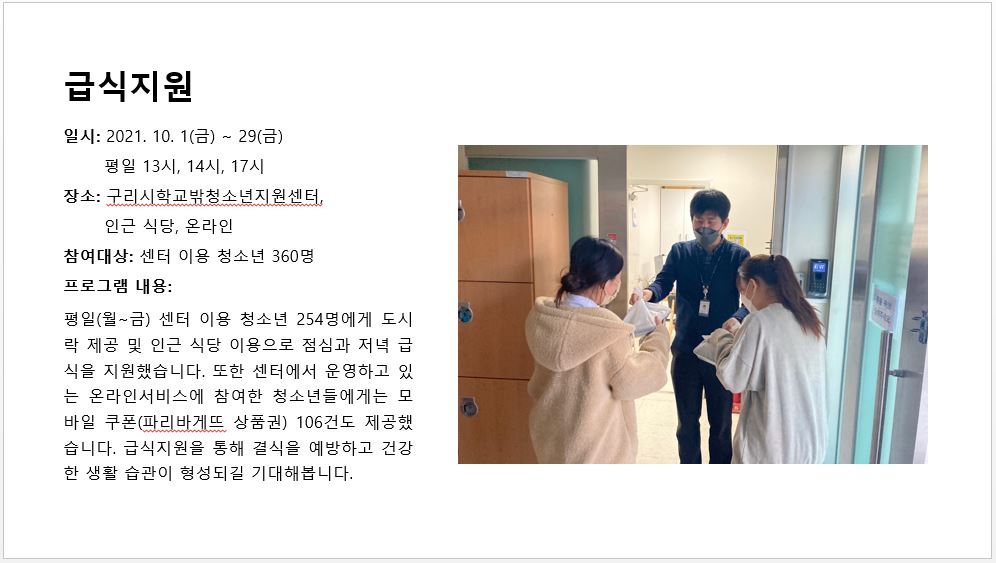 2021년 10월 급식지원(학교밖) 작성자 관리자 등록일자 2022년 1월 10일 11시 52분 47초 조회 476 학교밖-급식지원(10월).JPG [ Size : 78.22KB , Down : 222 ] 미리보기 다운로드 목록보기