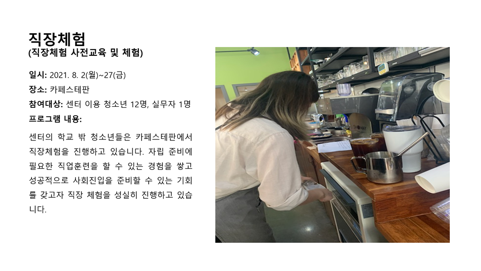 학교밖청소년지원센터-직장체험(직장체험 사전교육 및 체험) 작성자 관리자 등록일자 2021년 9월 6일 12시 56분 54초 조회 593 직장체험.png [ Size : 365.1KB , Down : 249 ] 미리보기 다운로드 목록보기