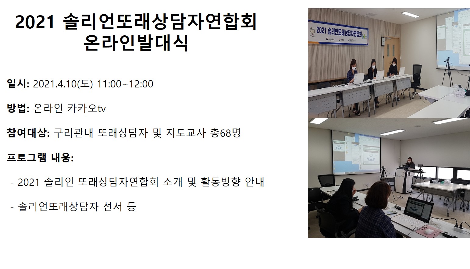 2021 솔리언또래상담자연합회 온라인 발대식 작성자 관리자 등록일자 2021년 5월 17일 18시 27분 34초 조회 648 . 4월 솔리언또래상담자연합회 온라인발대식.jpg [ Size : 204.28KB , Down : 242 ] 미리보기 다운로드 목록보기