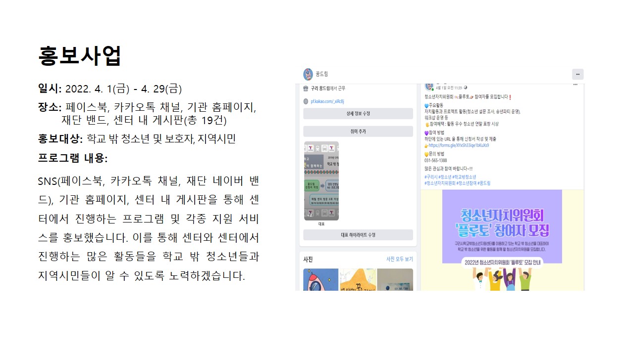 2022년 4월 홍보사업 (학교밖) 작성자 관리자 등록일자 2022년 5월 6일 11시 16분 35초 조회 437 10. 홍보사업(학교밖).JPG [ Size : 132.52KB , Down : 234 ] 미리보기 다운로드 목록보기