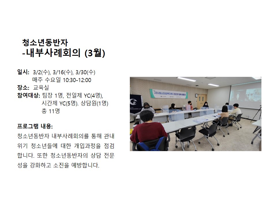 2022년 3월 청소년동반자_내부사례회의 작성자 관리자 등록일자 2022년 4월 8일 14시 11분 17초 조회 503 슬라이드1.JPG [ Size : 98.09KB , Down : 293 ] 미리보기 다운로드 목록보기