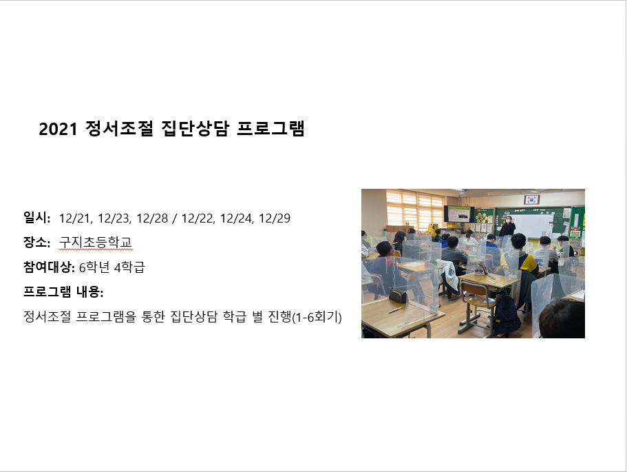 2021년 12월 정서조절 집단상담 프로그램 작성자 관리자 등록일자 2022년 1월 17일 16시 17분 47초 조회 553 12월 정서조절 집단상담 프로그램.JPG [ Size : 58.45KB , Down : 313 ] 미리보기 다운로드 목록보기
