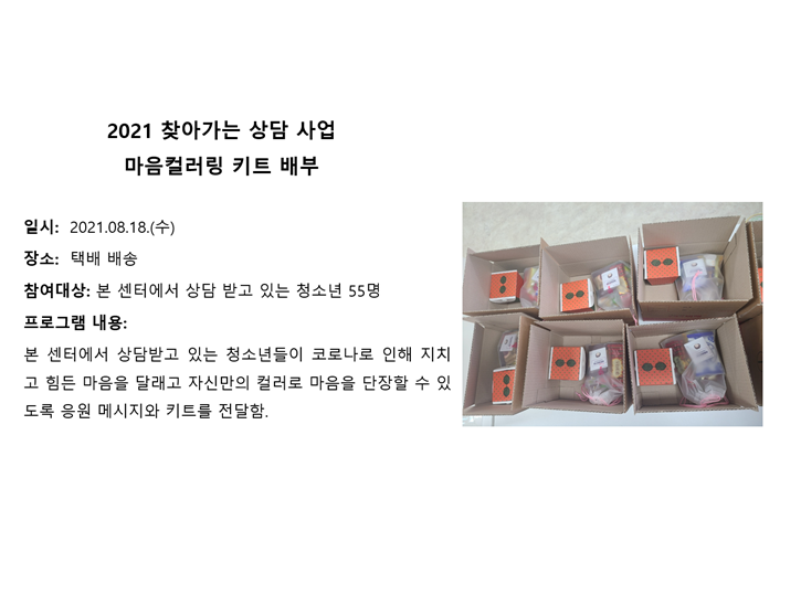 2021 찾아가는상담-마음컬러링키트 배부 작성자 관리자 등록일자 2021년 9월 7일 9시 13분 51초 조회 527 마음컬러링.png [ Size : 138.71KB , Down : 282 ] 미리보기 다운로드 목록보기