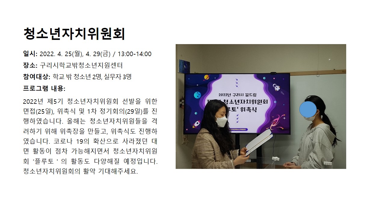 2022년 4월 청소년자치위원회 (학교밖) 작성자 관리자 등록일자 2022년 5월 6일 11시 12분 47초 조회 518 2. 청소년자치위원회.JPG [ Size : 153.03KB , Down : 217 ] 미리보기 다운로드 목록보기