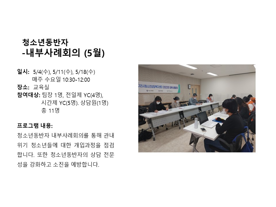 2022년 5월 청소년동반자_내부사례회의 작성자 관리자 등록일자 2022년 6월 10일 15시 45분 30초 조회 578 내부사례회의.JPG [ Size : 90.29KB , Down : 244 ] 미리보기 다운로드 목록보기