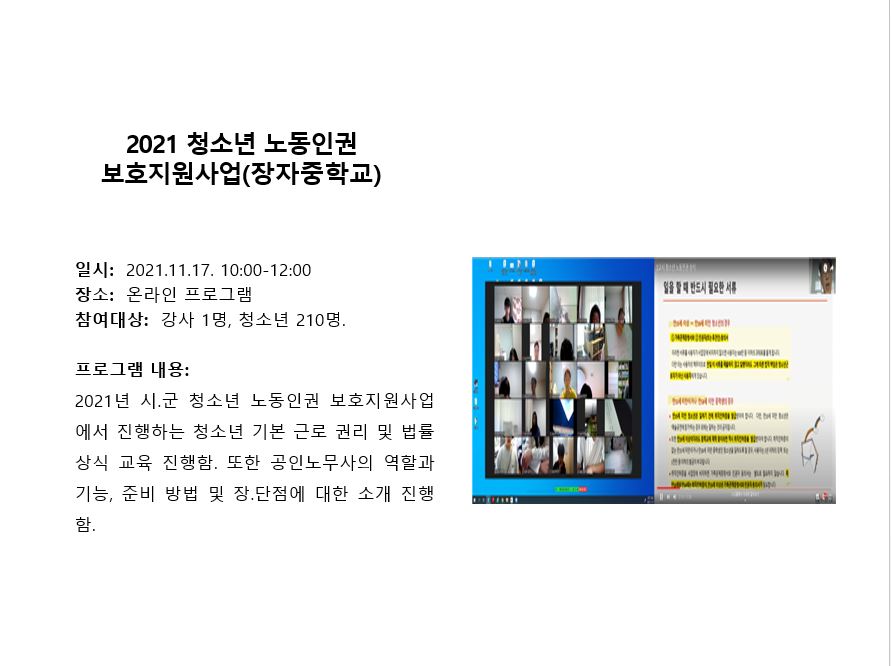 2021년 11월 청소년 노동인권 보호지원 사업 교육 작성자 관리자 등록일자 2022년 1월 17일 15시 26분 18초 조회 490 11월 노동인권 교육(장자중).JPG [ Size : 64.63KB , Down : 283 ] 미리보기 다운로드 목록보기