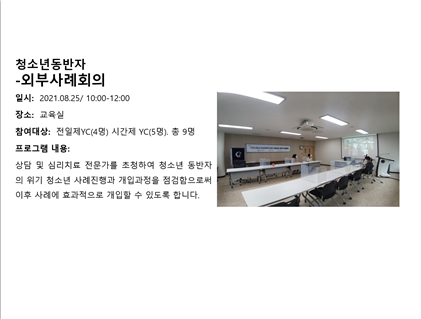 청소년동반자 8월 외부사례회의 작성자 관리자 등록일자 2021년 9월 6일 12시 47분 27초 조회 448 외부사례회의.png [ Size : 60.42KB , Down : 246 ] 미리보기 다운로드 목록보기